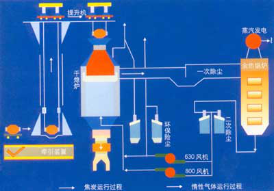干熄焦技術是利用冷的惰性氣體(燃燒后的廢氣),在干熄爐中與赤熱紅焦換熱從而冷卻紅焦。吸收了紅焦熱量的惰性氣體將熱量傳給干熄焦鍋爐產(chǎn)生蒸汽,被冷卻的惰性氣體再由循環(huán)風機鼓入干熄爐冷卻紅焦。干熄焦鍋爐產(chǎn)生的蒸汽或并入廠內(nèi)蒸汽管網(wǎng)或送去發(fā)電。二者在逆向運動中,焦炭逐漸被冷卻到250℃以下,然后由爐底的卸料裝置排出;同時,惰性氣體(或廢煙氣)被加熱到800℃左右,從干熄爐斜道口經(jīng)過一次除塵器后進入干熄焦鍋爐;在鍋爐中,水被熱氣流加熱產(chǎn)生蒸汽,同時氣體被冷卻到200℃左右,再經(jīng)二次除塵由循環(huán)風機重新送入干熄爐內(nèi)循環(huán)使用。