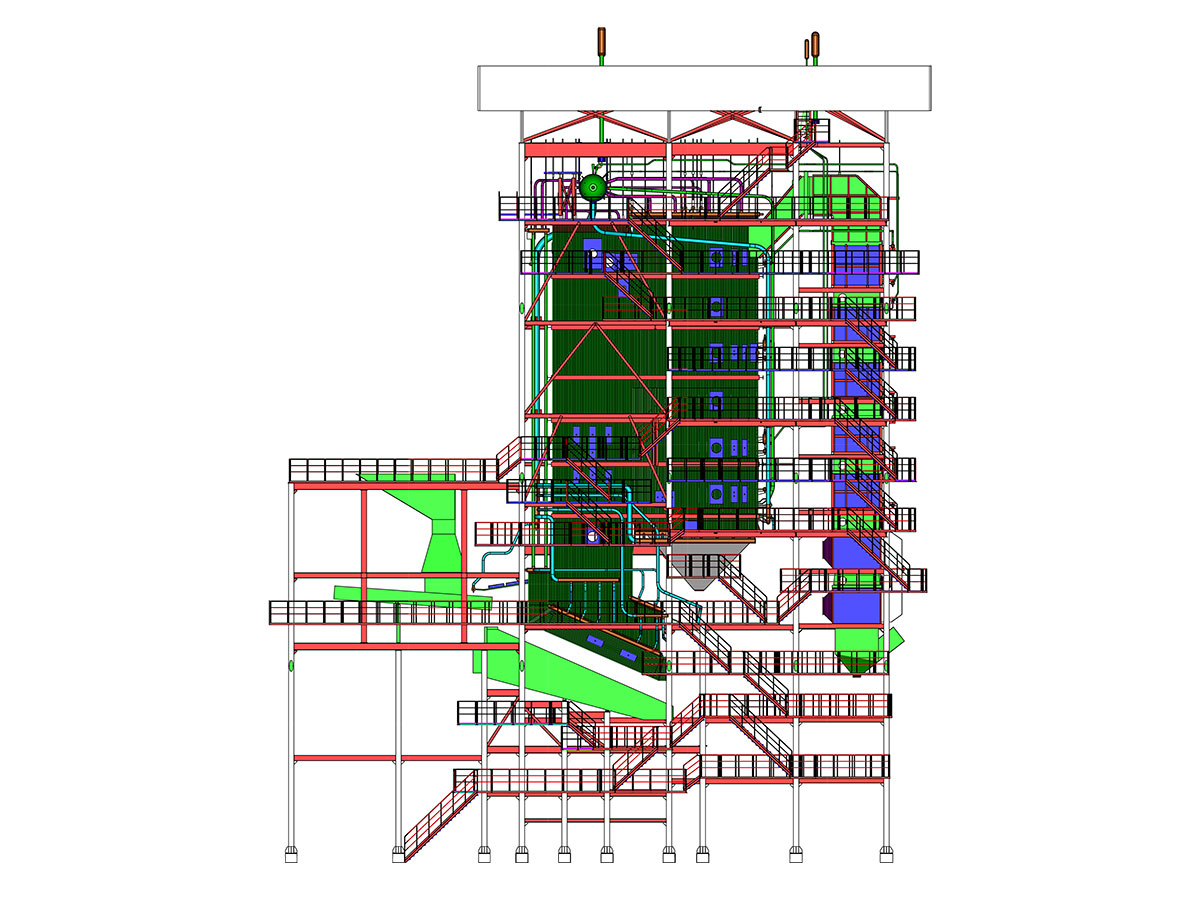 d. Fluidized bed boiler: It is reinforced with backward inclined air distribution plate to ensure the smooth discharge of large solidified materials; the external high temperature superheater is used to extend the service life of high temperature superheater; the large pitch tail heating surface is arranged, and the tube row is less. Blocked.